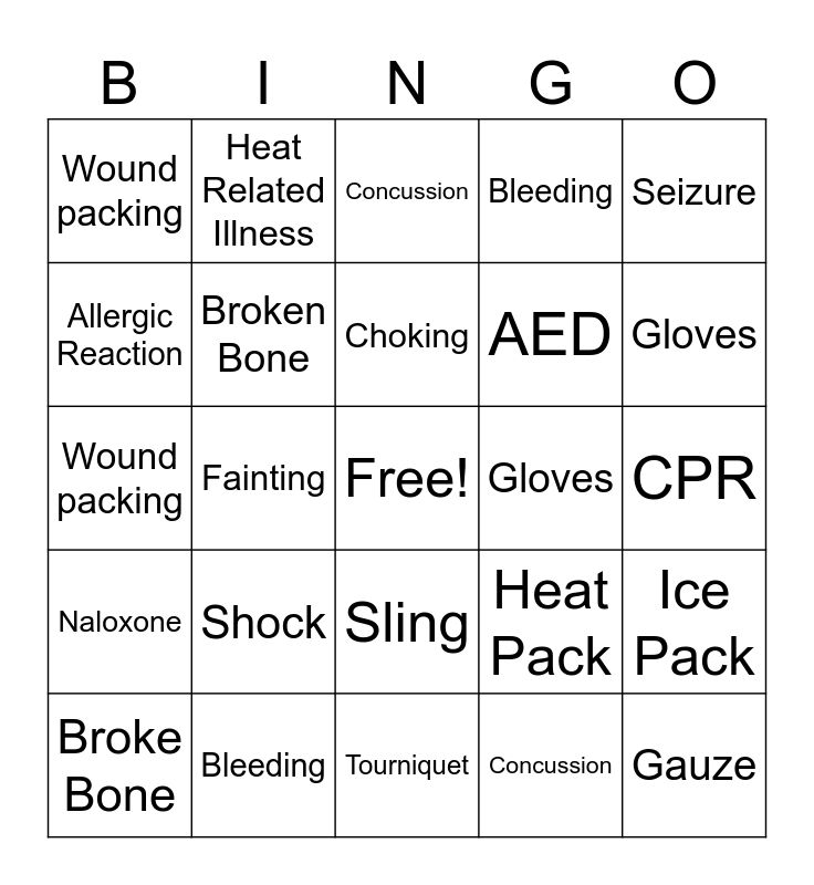 This bingo card has a free space and 48 words: CPR, Gauze, Direct Pressure, Tourniquet, Shock, Hypothermia, Heat Related Illness, Overdose, Allergic Reaction, Sling, Broken Bone, Bleeding, Ice Pack, Heat Pack, Epi Pen, Naloxone, Choking, Gloves, Rescue Breathing, Seizure, Fainting, Concussion, Wound packing, AED, Tourniquet, Gloves, Broke Bone, Direct Pressure, Sling, Naloxone, Seizure, Heat Related Illness, EpiPen, Ice Pack, Bleeding, Shock, Heat Pack, CPR, Fainting, Hypothermia, Choking, Overdose, Concussion, Gauze, Wound packing, Allergic Reaction, AED and Rescue Breathing.