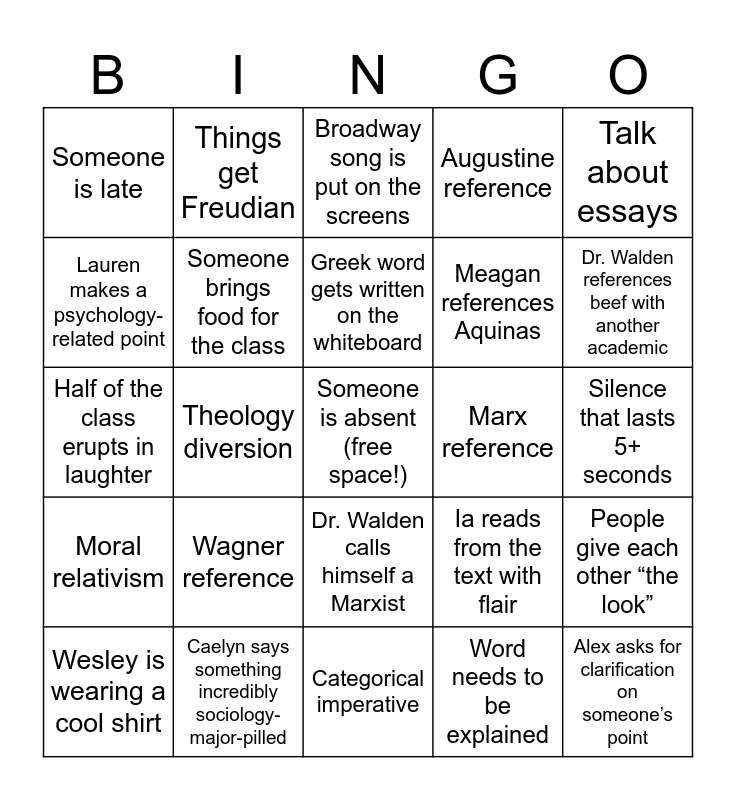 This bingo card has a free space and 36 words: “So what were everyone’s thoughts?” or any variation thereof, Someone loses their train of thought, Someone brings food for Dr. Walden, Someone brings food for the class, Ia reads from the text with flair, Moral relativism, Greek word gets written on the whiteboard, Discussion actually starts at 1:05 or later, Talk about essays, Don’t get to a major portion of the reading, Theology diversion, Augustine reference, Kierkegaard reference, Marx reference, Dr. Walden references beef with another academic, Someone is late, Flippant joke about Catholicism, Wagner reference, Alex asks for clarification on someone’s point, Broadway song is put on the screens, Silence that lasts 5+ seconds, People give each other “the look”, Caelyn says something incredibly sociology-major-pilled, Wesley is wearing a cool shirt, Categorical imperative, Things get Freudian, Half of the class erupts in laughter, Threats are made, Meagan references Aquinas, Lauren makes a psychology-related point, Argumentative back-and-forth replies, Plato reference, Word needs to be explained, Dr. Walden calls himself a Marxist, Emma R. references Nietzsche and Jadyn and Dr. Walden talk about theater.