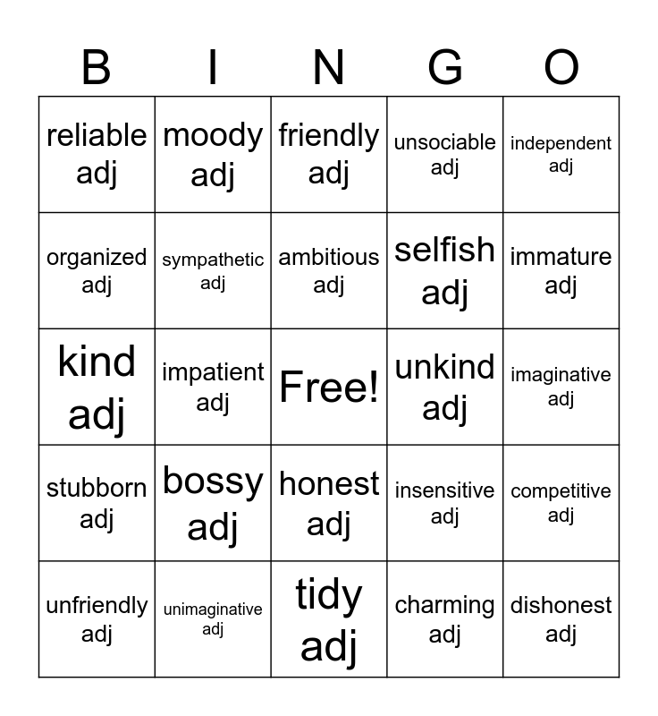 This bingo card has a free space and 42 words: affectionate adj, ambitious adj, anxious adj, bossy adj, charming adj, competitive adj, dishonest adj, disorganized adj, friendly adj, honest adj, imaginative adj, immature adj, impatient adj, independent adj, insecure adj, insensitive adj, irresponsible adj, kind adj, mature adj, moody adj, organized adj, patient adj, rebellious adj, reliable adj, responsible adj, self-confident adj, selfish adj, sensible adj, sensitive adj, sociable adj, spoilt adj, stubborn adj, sympathetic adj, tidy adj, unambitious adj, unfriendly adj, unimaginative adj, unkind adj, unreliable adj, unselfish adj, unsociable adj and untidy adj.