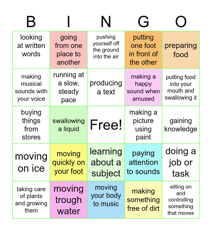 This bingo card has a free space and 24 words: moving quickly on your foot, moving trough water, producing a text, taking care of plants and growing them, preparing food, looking at written words, making musical sounds with your voice, going from one place to another, making a picture using paint, learning about a subject, making a happy sound when amused, buying things from stores, paying attention to sounds, doing a job or task, running at a slow, steady pace, making something free of dirt, gaining knowledge, pushing yourself off the ground into the air, putting food into your mouth and swallowing it, swallowing a liquid, sitting on and controlling something that moves, moving on ice, putting one foot in front of the other and moving your body to music.