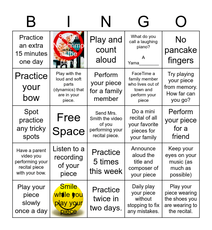 This bingo card has 2 images, a free space and 24 words: Listen to a recording of your piece, Smile while you play your piece, Perform your piece for a family member, Play your piece slowly once a day, No pancake fingers, Practice an extra 15 minutes one day, Practice your bow, Sit Tall No shrimp at the piano, Do a mini recital of all your favorite pieces for your family, Practice 5 times this week, FaceTime a family member who lives out of town and perform your piece, Spot practice any tricky spots, Announce aloud the title and composer of your piece, Keep your eyes on your music (as much as possible), Play with the loud and soft parts (dynamics) that are in your piece., Daily play your piece without stopping to fix any mistakes., Perform your piece for a friend, Play and count aloud, Try playing your piece from memory. How far can you go?, Free Space, Play your piece wearing the shoes you are wearing to the recital., Have a parent video you performing your recital piece with your bow., What do you call a laughing piano? A Yama________ and Practice twice in two days..