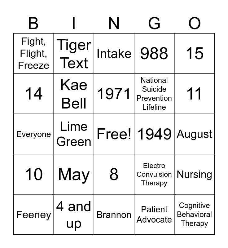 This bingo card has a free space and 24 words: May, 4 and up, 1971, Feeney, 15, Fight, Flight, Freeze, 14, Tiger Text, 1949, 8, National Suicide Prevention Lifeline, Everyone, Electro Convulsion Therapy, Nursing, Kae Bell, Patient Advocate, August, Intake, 11, Lime Green, Cognitive Behavioral Therapy, 10, 988 and Brannon.