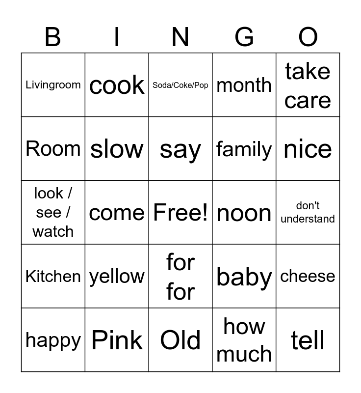 This bingo card has a free space and 144 words: Again/Repeat, always, ask you, asl, aunt, baby, bad, bathroom, Black, Blue, book, boy, boyfriend, bread, brother, Brown, buy, candy, care, cat, chat, cheese, children, class, clean, come, cook, cookies, dating, day, deaf, divorced, dog, don't understand, draw, drink, eat food, excited, family, father, fine, food, for for, future, girl, girlfriend, give to you, good/well, goodbye, grandfather, grandmother, hamburger, happy, hard of hearing, haven't / not yet, hearing, hello, home, hour, house, how, how much, Husband, I/Me, ice cream, Kitchen, know, language, late, learn, like, Livingroom, look / see / watch, love it, Man, meet, milk, minutes, month, more, Mother, My/Mine, nephew, never, nice, niece, noon, not/don't/doesn't, Old, Orange, paper, past, pay attention, Pink, play, please, Purple, Red, busy, right, Room, sad, same, sandwhich, say, scared, sentence, sign, sister, slow, so-so, Soda/Coke/Pop, spell again, take care, tell, Telphone, text, thank you, time, tired, uncle, understand, walk, want, week, what, what's up, When, where, which, white, Who, why, wife, Woman, work, write, wrong, year, yellow, yes, yet, you and your.
