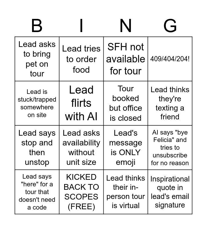 This bingo card has 28 words: Agent no-shows for tour, Lead says no one answered the phone, Lead says stop and then unstop, Lead sends multiple spam texts quickly, Lead flirts with AI, SFH not available for tour, Lead tries to order food, Inspirational quote in lead's email signature, KICKED BACK TO SCOPES (FREE), Wordle time!, Lead's message is ONLY emoji, 409/404/204!, Agent reactivates AI when they shouldn't, Lead sends a photo with no message, Lead asks availability without unit size, Someone curses at or threatens AI, Lead sends same question multiple times, Tour booked but office is closed, Lead thinks they're texting a friend, Multiple language price check spam bot, Lead asks to bring pet on tour, Lead asks question AI already answered, Lead says "here" for a tour that doesn't need a code, AI says "bye Felicia" and tries to unsubscribe for no reason, Lead thinks their in-person tour is virtual, AI calls lead by wrong name, Lead is stuck/trapped somewhere on site and Lead angry at message volume, never asked us to stop.