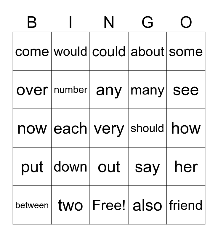 This bingo card has 25 words: put, two, very, also, some, come, would, could, should, her, over, number, Free!, say, see, between, each, any, many, how, now, down, out, about and friend.