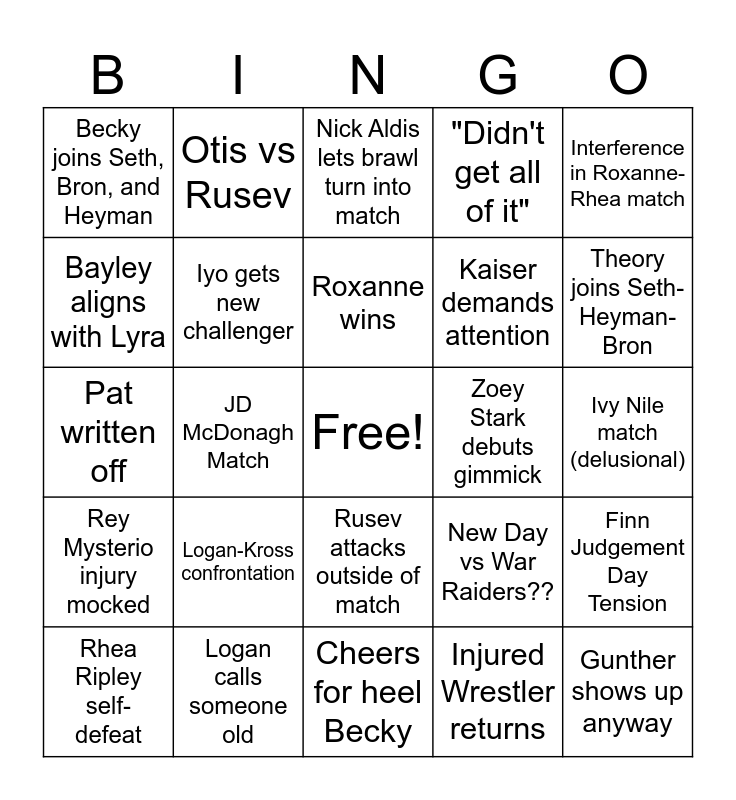 This bingo card has a free space and 24 words: Logan-Kross confrontation, Logan calls someone old, Roxanne wins, Rhea Ripley self-defeat, Interference in Roxanne-Rhea match, Becky joins Seth, Bron, and Heyman, Bayley aligns with Lyra, Otis vs Rusev, Zoey Stark debuts gimmick, Rusev attacks outside of match, Kaiser demands attention, Pat written off, New Day vs War Raiders??, Finn Judgement Day Tension, Iyo gets new challenger, Injured Wrestler returns, Ivy Nile match (delusional), Nick Aldis lets brawl turn into match, Theory joins Seth-Heyman-Bron, JD McDonagh Match, Gunther shows up anyway, Rey Mysterio injury mocked, "Didn't get all of it" and Cheers for heel Becky.