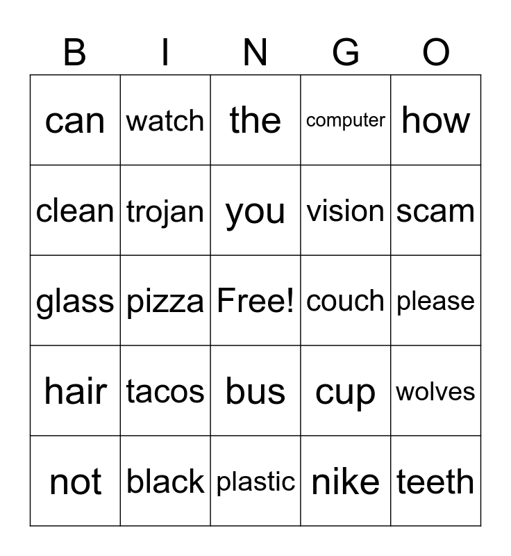 This bingo card has a free space and 24 words: tacos, black, you, not, how, can, clean, watch, couch, bus, vision, glass, cup, wolves, trojan, nike, please, the, scam, pizza, teeth, hair, computer and plastic.