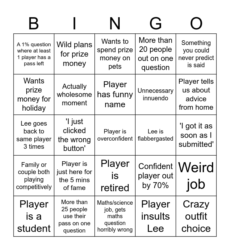 This bingo card has 28 words: Weird job, Obscure hobby, Unnecessary innuendo, Player insults Lee, Wants prize money for holiday, Wants to spend prize money on pets, Wild plans for prize money, Family or couple both playing competitively, Lee is flabbergasted, Player is a student, Lee goes back to same player 3 times, More than 20 people out on one question, More than 25 people use their pass on one question, Maths/science job, gets maths question horribly wrong, Player tells us about advice from home, Player just wants to meet Lee, Player is just here for the 5 mins of fame, Actually wholesome moment, Player has funny name, Player is retired, A 1% question where at least 1 player has a pass left, Crazy outfit choice, Player is overconfident, 'I just clicked the wrong button', 'I got it as soon as I submitted', Confident player out by 70%, Something you could never predict is said and Someone at home wants to watch them on tv.
