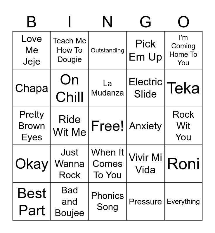 This bingo card has a free space and 24 words: Just Wanna Rock, Bad and Boujee, La Mudanza, Best Part, I'm Coming Home To You, Love Me Jeje, Chapa, Teach Me How To Dougie, Anxiety, When It Comes To You, Electric Slide, Pretty Brown Eyes, Vivir Mi Vida, Roni, On Chill, Pressure, Rock Wit You, Outstanding, Teka, Ride Wit Me, Everything, Okay, Pick Em Up and Phonics Song.