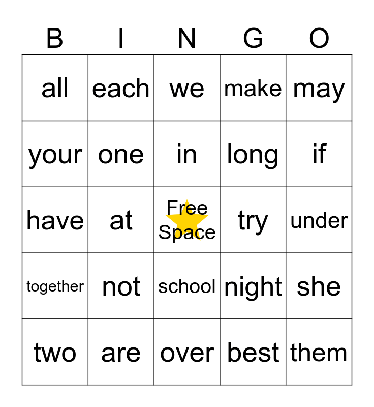 This bingo card has a free space and 54 words: family, together, wanted, people, school, little, make, was, your, food, all, look, are, two, there, over, them, long, how, under, night, air, try, may, play, each, small, four, Find, best, show, I, by, day, we, you, have, she, out, one, what, too, he, me, not, for, some, again, in, at, if, is, big and had.