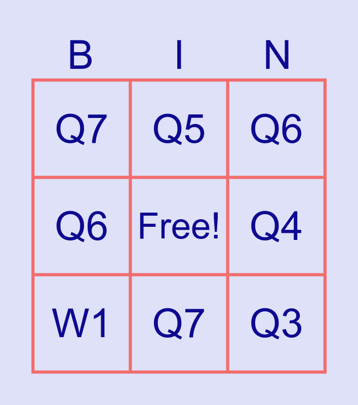 This bingo card has a free space and 12 words: Q1, Q2, Q3, Q4, Q5, Q6, Q7, Q8, Q7, Q6, W1 and 2.