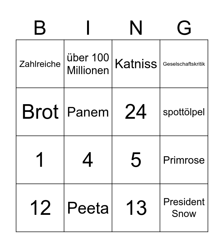 This bingo card has 16 words: Peeta, Primrose, Katniss, Zahlreiche, 1, über 100 Millionen, 5, 13, Brot, Panem, 12, Geselschaftskritik, 4, spottölpel, 24 and President Snow.