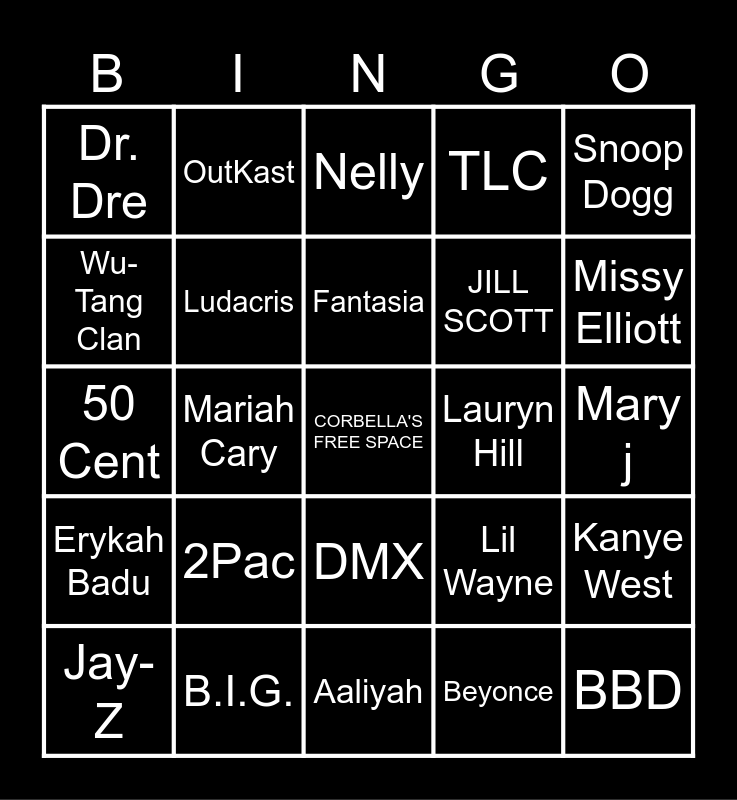 This bingo card has a free space and 24 words: 2Pac, B.I.G., Fantasia, Jay-Z, Snoop Dogg, Dr. Dre, Wu-Tang Clan, OutKast, Lauryn Hill, DMX, JILL SCOTT, 50 Cent, Lil Wayne, Kanye West, Ludacris, Beyonce, Mary j, Nelly, Missy Elliott, Mariah Cary, BBD, Erykah Badu, TLC and Aaliyah.