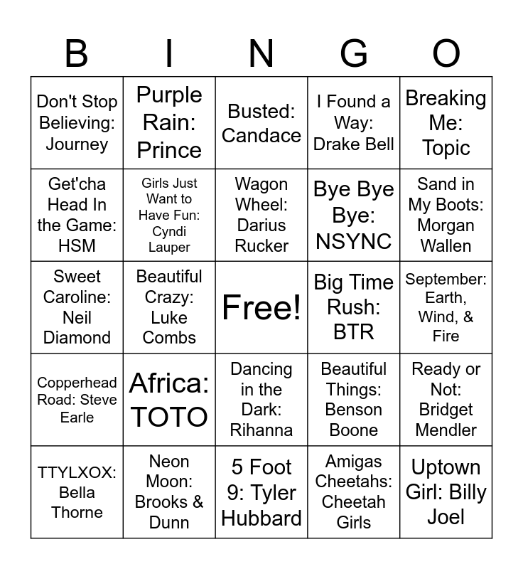 This bingo card has a free space and 117 words: Hey Jude: The Beatles, Had Me @ Hello: Luke Benward, Castle on the Hill: Ed Sheeran, Boom Boom Pow: Black Eyed Peas, Fire Burning: Sean Kingston, Top of the World: Mitchel Musso, I Found a Way: Drake Bell, Bad Medicine: Bon Jovi, Paralyzed: BTR, Burn the Ships: For King and Country, Someone To You: BANNERS, Tidal: Noah Kahan, Paradise: Coldplay, Cooler Than Me: Mike Posner, Tonight Tonight: Hot Chelle Rae, Misery: Maroon 5, Dancing in the Dark: Rihanna, Hot Wings: will.i.am, Someday: Rags Cast, Walking on Sunshine: Aly&AJ, TTYLXOX: Bella Thorne, Busted: Candace, I Don't Dance: HSM, Let It Grow: The Lorax, Fishin In The Dark: Nitty Gritty Dirt Band, Copperhead Road: Steve Earle, Neon Moon: Brooks & Dunn, Cotton Eye Joe: Rednex, Boot Scootin' Boogie: Brooks & Dunn, Pickup Man: Joe Diffie, Sand in My Boots: Morgan Wallen, Wagon Wheel: Darius Rucker, Beautiful Crazy: Luke Combs, Real Gone: Sheryl Crow, Life is a Highway: Rascal Flatts, Paradise City: Guns N Roses, Welcome to the Jungle: Guns N Roses, Another One Bites the Dust: Queen, Rocket Man: Elton John, Free Fallin: Tom Petty, Billie Jean: Michael Jackson, Thunderstruck: AC/DC, Free Bird: Lynyrd Skynyrd, Hotel California: Eagles, Viva La Vida: Coldplay, Bohemian Rhapsody: Queen, Amigas Cheetahs: Cheetah Girls, Get'cha Head In the Game: HSM, Burnin Up: Jonas Brothers, Fabulous: Sharpay Evans, What Dreams Are Made Of: Hilary Duff, Big Time Rush: BTR, A Billion Hits: Austin Moon, The Boys Are Back: HSM, Better in Stero: Liv and Maddie, Determinate: Lemonade Mouth, Breaking Free: HSM, This is Me: Camp Rock, Replay: Zendaya, Hurricane: Bridget Mendler, Ready or Not: Bridget Mendler, Heat Waves: Glass Animals, Summer: Calvin Harris, Left Hand Free: alt-J, Sunroof: Nicky-Youre, Pink Skies: Zach Bryan, Young Blood: Noah Kahan, Girls Just Want to Have Fun: Cyndi Lauper, Sweet Caroline: Neil Diamond, Crank That: Souja Boy, September: Earth, Wind, & Fire, Hot N Cold: Katy Perry, Year 3000: Jonas Brothers, Ring of Fire: Johnny Cash, Piano Man: Billy Joel, Purple Rain: Prince, Uptown Girl: Billy Joel, Africa: TOTO, Don't Stop Believing: Journey, Dancing Queen: ABBA, Sky Full of Stars: Coldplay, Yellow: Coldplay, Stick Season: Noah Kahan, Die For You: The Weekend, Beautiful Things: Benson Boone, Good Luck, Babe: Chappell Roan, Bye Bye Bye: NSYNC, Unwritten: Natasha Bedingfield, Bad Dreams: Teddy Swims, I Had Some Help: Post Malone, Pink Pony Club: Chappell Roan, Flowers: Miley Cyrus, Taste: Sabrina Carpenter, Die WIth a Smile: Lady Gaga/Bruno Mars, Light Switch: Charlie Puth, Breaking Me: Topic, Need You Now: Lady A, Won't Back Down: Sam Elliot, Someone Like You: Noah Kahan, Anyway: Noah Kahan, golden hour: JVKE, She Looks So Perfect: 5 Seconds of Summer, Ordinary People: John Legend, Do It Again: R5, Green Eyes: Jake Scott, Bad Habits: Ed Sheeran, Overdrive: Post Malone, Different: Micah Tyler, Hollywood's Bleeding: Post Malone, Bones: Imagine Dragons, 5 Foot 9: Tyler Hubbard, As It Was: Harry Styles, No Idea: Don Toliver, Tennessee Orange: Megan Moroney, Lady May: Tyler Childers, Somebody's Problem: Morgan Wallen and Home: Daughtry.