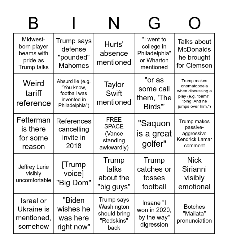 This bingo card has a free space and 24 words: [Trump voice] "Big Dom", "Biden wishes he was here right now", Taylor Swift mentioned, Israel or Ukraine is mentioned, somehow, Talks about McDonalds he brought for Clemson, Midwest-born player beams with pride as Trump talks, Weird tariff reference, Trump says defense "pounded" Mahomes, "Saquon is a great golfer", Trump talks about the "big guys", "or as some call them, 'The Birds'", Fetterman is there for some reason, Trump catches or tosses football, Nick Sirianni visibly emotional, Absurd lie (e.g. "You know, football was invented in Philadelphia"), Insane "I won in 2020, by the way" digression, Trump makes passive-aggressive Kendrick Lamar comment, Hurts' absence mentioned, Trump makes onomatopoeia when discussing a play (e.g. "bam!", "bing! And he jumps over him,"), References cancelling invite in 2018, Botches "Mailata" pronunciation, Jeffrey Lurie visibly uncomfortable, "I went to college in Philadelphia" or Wharton mentioned and Trump says Washington should bring "Redskins" back.
