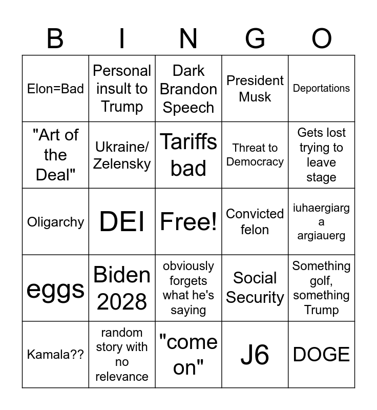 This bingo card has a free space and 24 words: Biden 2028, random story with no relevance, Tariffs bad, Kamala??, Deportations, Elon=Bad, "Art of the Deal", Personal insult to Trump, Convicted felon, obviously forgets what he's saying, Threat to Democracy, Oligarchy, Social Security, Something golf, something Trump, Ukraine/ Zelensky, J6, iuhaergiarg a argiauerg, Dark Brandon Speech, Gets lost trying to leave stage, DEI, DOGE, eggs, President Musk and "come on".