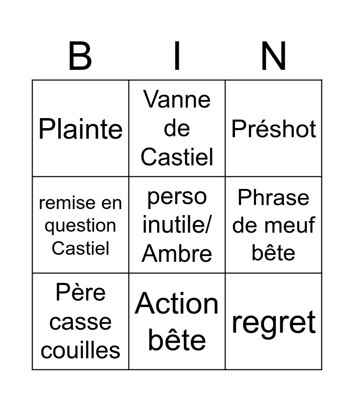 This bingo card has a free space and 8 words: Phrase de meuf bête, Préshot, Vanne de Castiel, Père casse couilles, Plainte, regret, remise en question Castiel and Action bête.