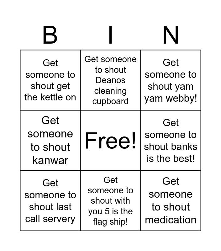 This bingo card has a free space and 8 words: Get someone to shout banks is the best!, Get someone to shout yam yam webby!, Get someone to shout Deanos cleaning cupboard, Get someone to shout last call servery, Get someone to shout get the kettle on, Get someone to shout medication, Get someone to shout kanwar and Get someone to shout with you 5 is the flag ship!.