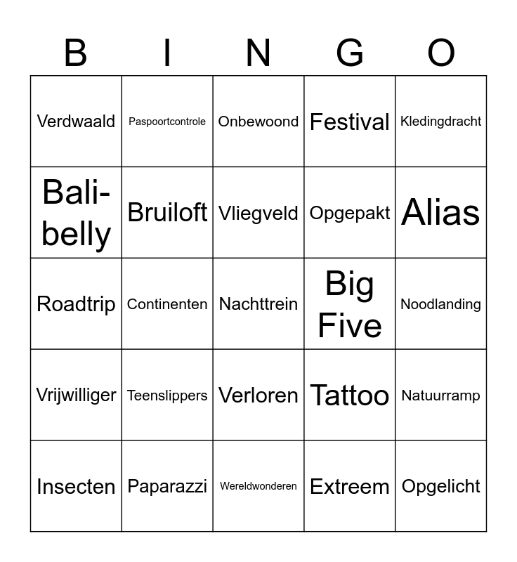 This bingo card has 25 words: Teenslippers, Wereldwonderen, Vliegveld, Insecten, Kledingdracht, Verdwaald, Bali-belly, Paspoortcontrole, Big Five, Verloren, Opgepakt, Roadtrip, Tattoo, Natuurramp, Bruiloft, Opgelicht, Noodlanding, Onbewoond, Alias, Continenten, Nachttrein, Paparazzi, Vrijwilliger, Festival and Extreem.