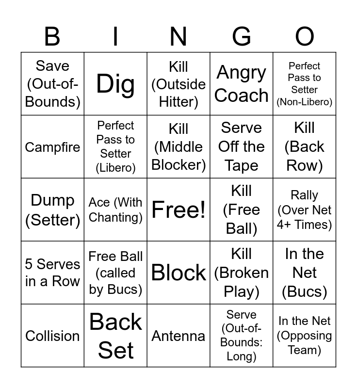 This bingo card has a free space and 33 words: Jump Serve, Ace (Quiet), Ace (With Chanting), Ace (Back to Back), 5 Serves in a Row, Perfect Pass to Setter (Libero), Perfect Pass to Setter (Non-Libero), Collision, Dig, Timeout (Due to Buc Streak), Kill (Middle Blocker), Kill (Outside Hitter), Kill (Opposite Hitter), Kill (Tip), Kill (Free Ball), Kill (Back Row), Back Set, Dump (Setter), Free Ball (called by Bucs), Kill (Broken Play), Block, Save (Diving), Save (Out-of-Bounds), Rally (Over Net 4+ Times), Antenna, In the Net (Opposing Team), Angry Coach, Serve Off the Tape, Campfire, In the Net (Bucs), Serve (Into the Net), Serve (Out-of-Bounds: Long) and Serve (Out-of-Bounds: Wide).