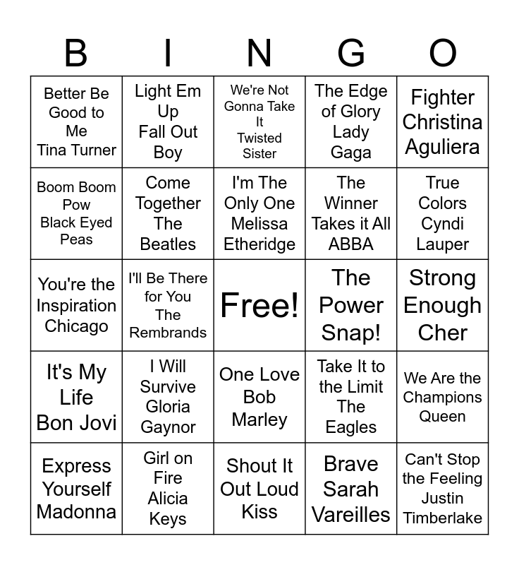This bingo card has a free space and 24 words: I Will Survive Gloria Gaynor, Girl on Fire Alicia Keys, I'm The Only One Melissa Etheridge, Express Yourself Madonna, Fighter Christina Aguliera, Better Be Good to Me Tina Turner, Boom Boom Pow Black Eyed Peas, Light Em Up Fall Out Boy, The Power Snap!, One Love Bob Marley, The Winner Takes it All ABBA, You're the Inspiration Chicago, Take It to the Limit The Eagles, We Are the Champions Queen, Come Together The Beatles, Brave Sarah Vareilles, Strong Enough Cher, We're Not Gonna Take It Twisted Sister, True Colors Cyndi Lauper, I'll Be There for You The Rembrands, Can't Stop the Feeling Justin Timberlake, It's My Life Bon Jovi, The Edge of Glory Lady Gaga and Shout It Out Loud Kiss.