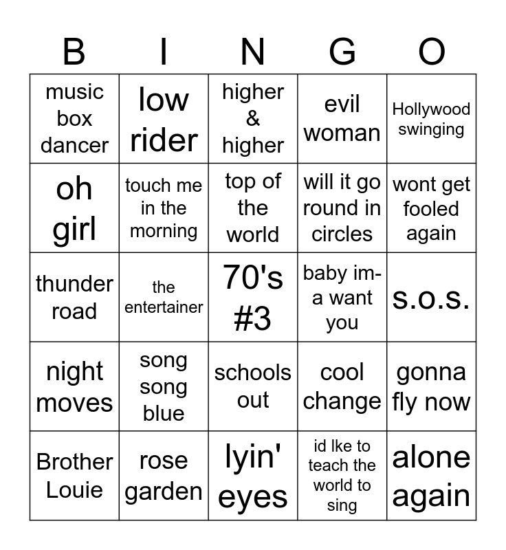This bingo card has a free space and 74 words: Do you wanna make love, we will rock you, higher & higher, Love is the drug, Sweet gypsy rose, September, bridge over troubled water, stairway to heaven, Brother Louie, stuck in the middle with you, Sylvias Mother, Take it to the limit, top of the world, oh girl, ill take you there, the entertainer, just my imagination, wont get fooled again, three times a lady, thunder road, touch me in the morning, low rider, evil woman, the chain, alone again, midnight train to Georgia, go away little girl, wreck of the Edmund Fitzgerald, sara smile, without you, Hollywood swinging, how deep is your love, i am woman, i can see clearly now, i like dreamin', id lke to teach the world to sing, id love you to want me, mr. big stuff, i need a lover, jungle boogie, lyin' eyes, rose garden, baby dont get hooked on me, money, how do you do, music box dancer, my eyes adored you, song song blue, you dont bring me flowers anymore, love rollercoaster, let me be there, mamma mia, s.o.s., take a chance on me, dream on, aint no mountain high enough, schools out, sister golden hair, shadow dancing, gonna fly now, will it go round in circles, black and white, night moves, sunny, baby im-a want you, love will keep us together, kung fu fighting, close to you, cool change, chick a boom, sultans of swing, American pie, puppy love and down by the lazy river.