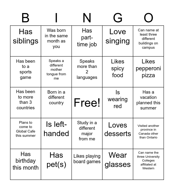 This bingo card has a free space and 24 words: Is left-handed, Has pet(s), Speaks more than 2 languages, Has birthday this month, Can name at least three different buildings on campus, Has siblings, Has been to a sports game, Was born in the same month as you, Is wearing red, Study in a different major from me, Likes spicy food, Has been to more than 3 countries, Loves desserts, Visited another province in Canada other than Ontario, Speaks a different mother tongue from me, Wear glasses, Has a vacation planned this summer, Has part-time job, Likes pepperoni pizza, Born in a different country, Can name the three University Colleges affiliated at Western, Plans to come to Global Cafe this summer, Love singing and Likes playing board games.