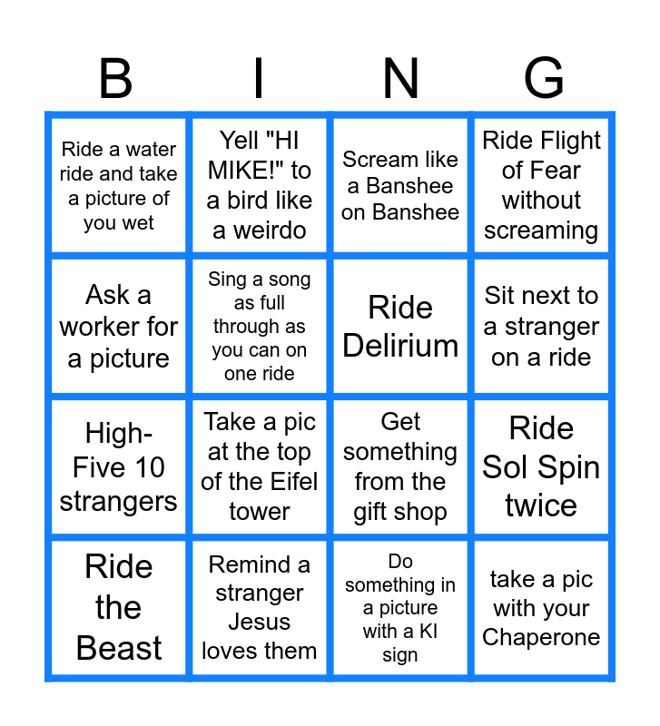 This bingo card has 17 words: Do something in a picture with a KI sign, Ride the Beast, Scream like a Banshee on Banshee, Ride a water ride and take a picture of you wet, Take a pic at the top of the Eifel tower, Ride Flight of Fear without screaming, Ride Sol Spin twice, Ride Delirium, Sit next to a stranger on a ride, Sing a song as full through as you can on one ride, Remind a stranger Jesus loves them, Get something from the gift shop, Ask a worker for a picture, Yell "HI MIKE!" to a bird like a weirdo, High-Five 10 strangers, Ride drop tower and take a pic with your Chaperone.