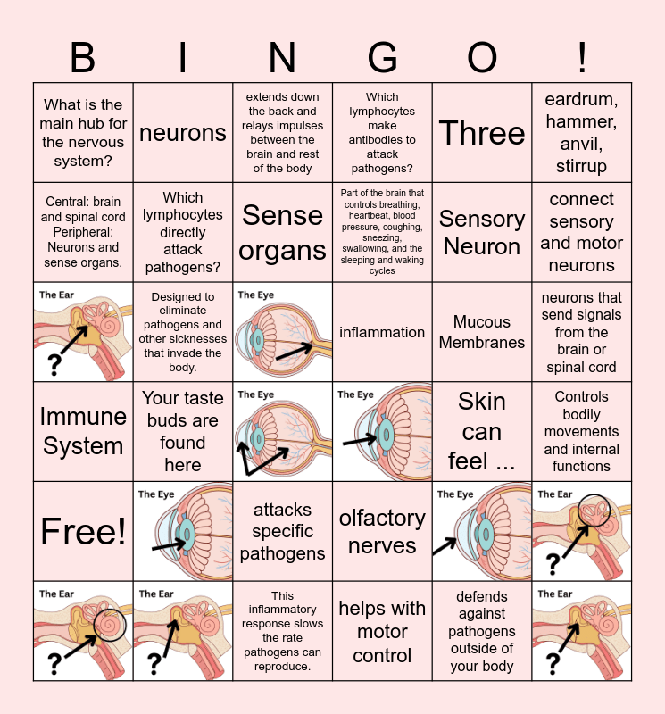 This bingo card has 13 images and 29 words: Immune System, Designed to eliminate pathogens and other sicknesses that invade the body., What are the three lines of defense for the immune system?, Which lymphocytes make antibodies to attack pathogens?, Mucous Membranes, Controls bodily movements and internal functions, Central: brain and spinal cord Peripheral: Neurons and sense organs., Cerebrum, extends down the back and relays impulses between the brain and rest of the body, Part of the brain that controls breathing, heartbeat, blood pressure, coughing, sneezing, swallowing, and the sleeping and waking cycles, Sensory Neuron, connect sensory and motor neurons, What is the main hub for the nervous system?, Which lymphocytes directly attack pathogens?, This inflammatory response slows the rate pathogens can reproduce., inflammation, defends against pathogens outside of your body, neurons that send signals from the brain or spinal cord, Free!, neurons, Sense organs, olfactory nerves, Skin can feel ..., eardrum, hammer, anvil, stirrup, Your taste buds are found here, attacks specific pathogens, helps with motor control, Three and Nerve cells.