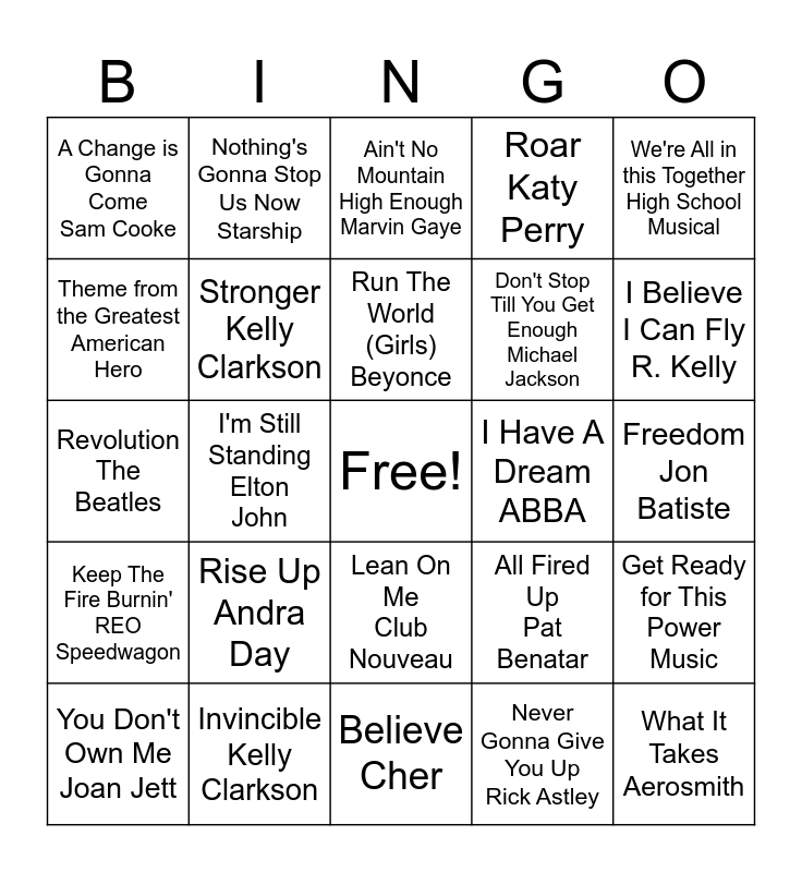 This bingo card has a free space and 24 words: Rise Up Andra Day, Invincible Kelly Clarkson, Run The World (Girls) Beyonce, You Don't Own Me Joan Jett, We're All in this Together High School Musical, A Change is Gonna Come Sam Cooke, Theme from the Greatest American Hero, Nothing's Gonna Stop Us Now Starship, I Have A Dream ABBA, Lean On Me Club Nouveau, Don't Stop Till You Get Enough Michael Jackson, Revolution The Beatles, All Fired Up Pat Benatar, Get Ready for This Power Music, Stronger Kelly Clarkson, Never Gonna Give You Up Rick Astley, Freedom Jon Batiste, Ain't No Mountain High Enough Marvin Gaye, I Believe I Can Fly R. Kelly, I'm Still Standing Elton John, What It Takes Aerosmith, Keep The Fire Burnin' REO Speedwagon, Roar Katy Perry and Believe Cher.