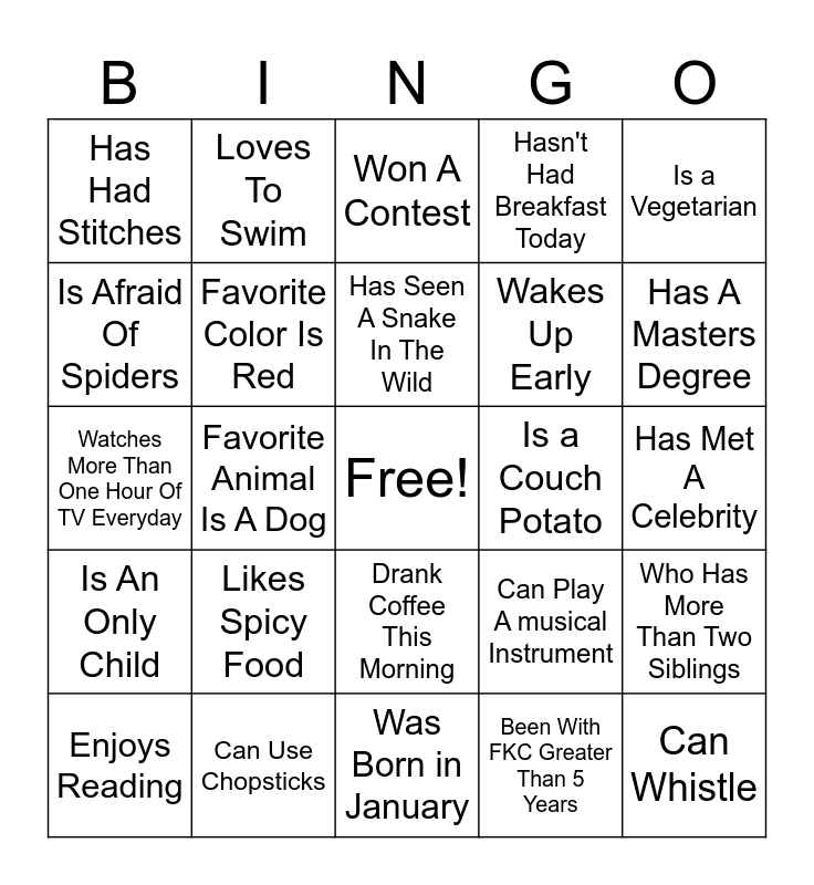 This bingo card has a free space and 24 words: Likes Spicy Food, Can Use Chopsticks, Has Seen A Snake In The Wild, Enjoys Reading, Is a Vegetarian, Has Had Stitches, Is Afraid Of Spiders, Loves To Swim, Is a Couch Potato, Drank Coffee This Morning, Wakes Up Early, Watches More Than One Hour Of TV Everyday, Can Play A musical Instrument, Who Has More Than Two Siblings, Favorite Color Is Red, Been With FKC Greater Than 5 Years, Has Met A Celebrity, Won A Contest, Has A Masters Degree, Favorite Animal Is A Dog, Can Whistle, Is An Only Child, Hasn't Had Breakfast Today and Was Born in January.