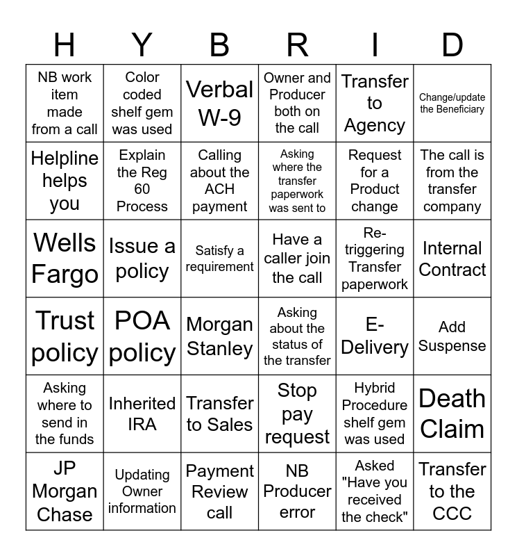 This bingo card has 61 words: Free!, Asking about the status of the transfer, Back Office is on the line, Have a caller join the call, Add Suspense, Reissue request, Helpline helps you, Follow up call requested, Calling about the ACH payment, Calling about a producer error, Owner and Producer both on the call, Issued policy, Change/update the Beneficiary, JP Morgan Chase, Cancelled a policy, NB work item made from a call, Wells Fargo, Transfer to Agency, Search for a policy using an SSN, Explain the Reg 60 Process, Issue a policy, Verbal W-9, Morgan Stanley, POA policy, Ignore the TVF for beneficiary, Updating Owner information, Hybrid Procedure shelf gem was used, Re-issue request, Asking where the transfer paperwork was sent to, NB Producer error, Making a change to the allocations, Put in a Manager Request, Where was the delivery packet sent, Asking for the Issue date, Color coded shelf gem was used, Inherited IRA, Sending blank forms, The call is from the transfer company, Payment Review call, Request for a Product change, Status check, Re-triggering Transfer paperwork, Satisfy a requirement, Unable to Verify a Caller, Trust policy, Stop pay request, UTMA/UGMA Contract, Rates, Portal how to locate rates, Internal Contract, E-Delivery, De-escalate, Transfer to the CCC, Transfer to Sales, Merrill Lynch Policy, Death Claim, Asked "Have you received the check", Ignore CVF for Beneficiary, Receive praise from a caller, Asking where to send in the funds and Transfer to suit.