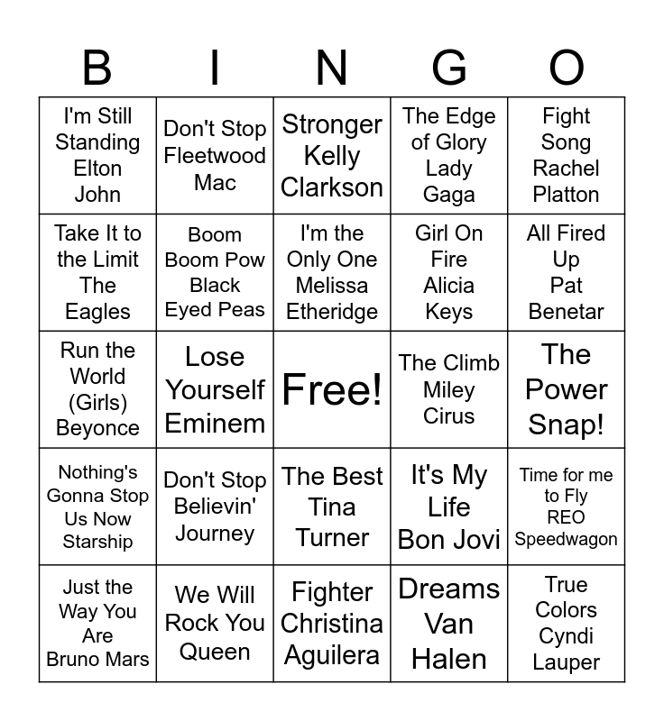 This bingo card has a free space and 24 words: Don't Stop Believin' Journey, We Will Rock You Queen, I'm the Only One Melissa Etheridge, Just the Way You Are Bruno Mars, Fight Song Rachel Platton, I'm Still Standing Elton John, Take It to the Limit The Eagles, Don't Stop Fleetwood Mac, The Climb Miley Cirus, The Best Tina Turner, Girl On Fire Alicia Keys, Run the World (Girls) Beyonce, It's My Life Bon Jovi, Time for me to Fly REO Speedwagon, Boom Boom Pow Black Eyed Peas, Dreams Van Halen, The Power Snap!, Stronger Kelly Clarkson, All Fired Up Pat Benetar, Lose Yourself Eminem, True Colors Cyndi Lauper, Nothing's Gonna Stop Us Now Starship, The Edge of Glory Lady Gaga and Fighter Christina Aguilera.