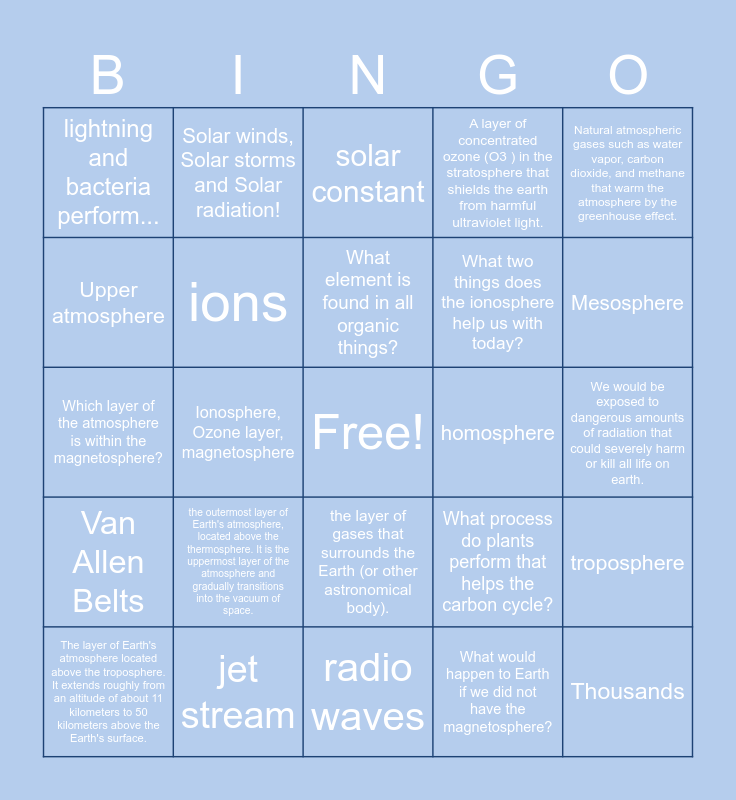 This bingo card has a free space and 34 words: Stratosphere, 3 oxygen molecules, Over where on Earth can you find the thin spot of the ozone?, Ultraviolet Radiation, We would be exposed to dangerous amounts of radiation that could severely harm or kill all life on earth., Upper atmosphere, ions, radio waves, What two things does the ionosphere help us with today?, Thousands, Which layer of the atmosphere is within the magnetosphere?, Solar winds, Solar storms and Solar radiation!, What would happen to Earth if we did not have the magnetosphere?, What beautiful phenomenon occurs in the magnetosphere?, Van Allen Belts, Ionosphere, Ozone layer, magnetosphere, the layer of gases that surrounds the Earth (or other astronomical body)., homosphere, troposphere, The layer of Earth's atmosphere located above the troposphere. It extends roughly from an altitude of about 11 kilometers to 50 kilometers above the Earth's surface., jet stream, lapse rate, A layer of concentrated ozone (O3 ) in the stratosphere that shields the earth from harmful ultraviolet light., Mesosphere, Thermosphere, the outermost layer of Earth's atmosphere, located above the thermosphere. It is the uppermost layer of the atmosphere and gradually transitions into the vacuum of space., solar constant, greenhouse effect, Natural atmospheric gases such as water vapor, carbon dioxide, and methane that warm the atmosphere by the greenhouse effect., lightning and bacteria perform..., Plants, What element is found in all organic things?, What process do plants perform that helps the carbon cycle? and Nitrogen Oxygen Argon Carbon Dioxide Water Vapor Many more.