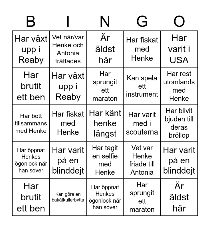 ⚠ This card has duplicate items: Kan spela ett instrument (2), Har brutit ett ben (2), Har sprungit ett maraton (2), Är äldst här (2), Kan säga skål på tre olika språk (2), Kan göra en bakåtkullerbytta (2), Har fiskat med Henke (2), Har varit med i scouterna (2), Har tagit en selfie med Henke (2), Har varit på en blinddejt (2), Är yngst här (2), Har öppnat Henkes ögonlock när han sover (2), Vet var Henke friade till Antonia (2), Vet när/var Henke och Antonia träffades (2), Har blivit bjuden till deras bröllop (2), Har växt upp i Reaby (2)
