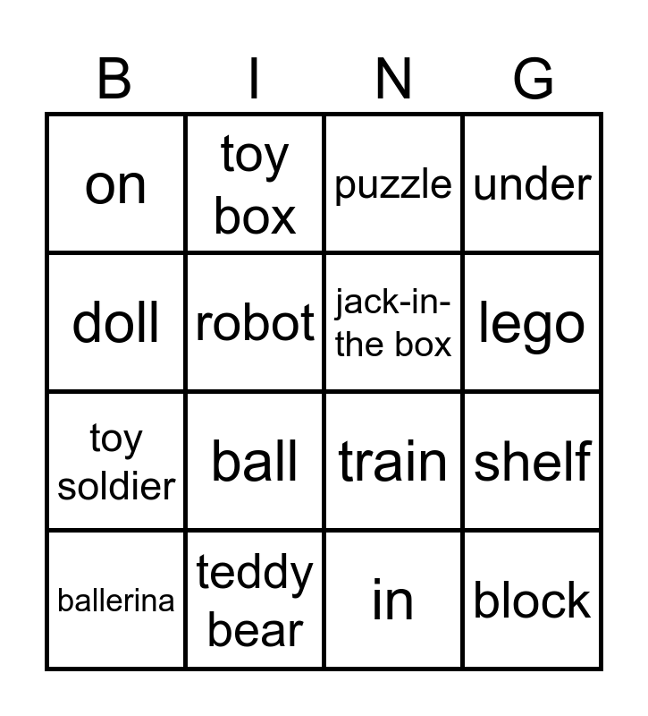 This bingo card has 16 words: teddy bear, shelf, puzzle, on, toy soldier, toy box, train, in, doll, robot, ballerina, under, ball, lego, jack-in-the box and block.