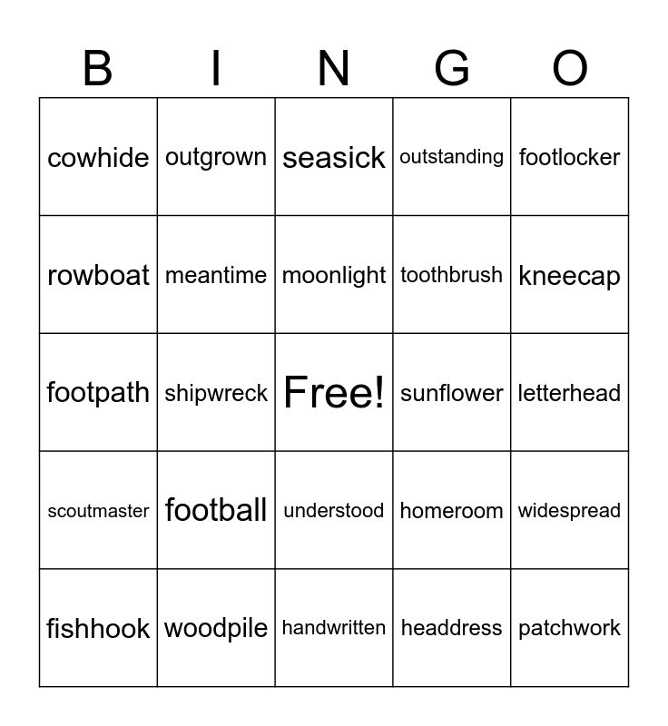 This bingo card has a free space and 24 words: football, woodpile, moonlight, fishhook, footlocker, cowhide, rowboat, outgrown, sunflower, understood, toothbrush, footpath, homeroom, widespread, meantime, headdress, letterhead, seasick, kneecap, shipwreck, patchwork, scoutmaster, outstanding and handwritten.