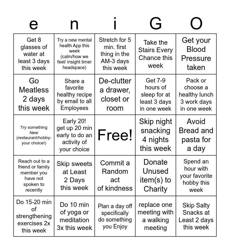 This bingo card has a free space and 38 words: Schedule a DR apt or screening, Hit 10,000 steps 3x this week, Enjoy a sunrise or a sunset, Share a favorite healthy recipe by email to all Employees, Spend an hour with your favorite hobby this week, Skip sweets at Least 2 Days this week, De-clutter a drawer, closet or room, Give someone a WOW watch!, Get your Blood Pressure taken, Get 7-9 hours of sleep for at least 3 days in one week, Early 20! get up 20 min early to do an activity of your choice, Take the Stairs Every Chance this week, Skip Salty Snacks at Least 2 days this week, Avoid Bread and pasta for a day, Go Meatless 2 days this week, Reach out to a friend or family member you have not spoken to recently, Track your Calorie intake for 3 days in a row, Stretch for 5 min. first thing in the AM-3 days this week, Get 30 min of dedicated exercise at least 3x this week, Skip night snacking 4 nights this week, Get 8 glasses of water at least 3 days this week, Do 10 min of yoga or meditation 3x this week, Pack or choose a healthy lunch 3 work days in one week, Do 15-20 min of strengthening exercises 2x this week, Play a Yard or Board Game with friends/fam, Plan a day off specifically do something you Enjoy, Take 3 walking breaks this week, Write down 3 things you are grateful for, 3 times this week, Star Gaze for at least 10 minutes, Do a day of tech DETOX no screens, Get in touch with nature (a hike, swim,walk in the woods), Commit a Random act of kindness, replace one meeting with a walking meeting, Try a new mental health App this week (calm/how we feel/ insight timer headspace), Make a "Feel-good" Playlist, Donate Unused item(s) to Charity, Try something New (restaurant/hobby- your choice!) and Try a positive Daily Affirmation 3 days this week.
