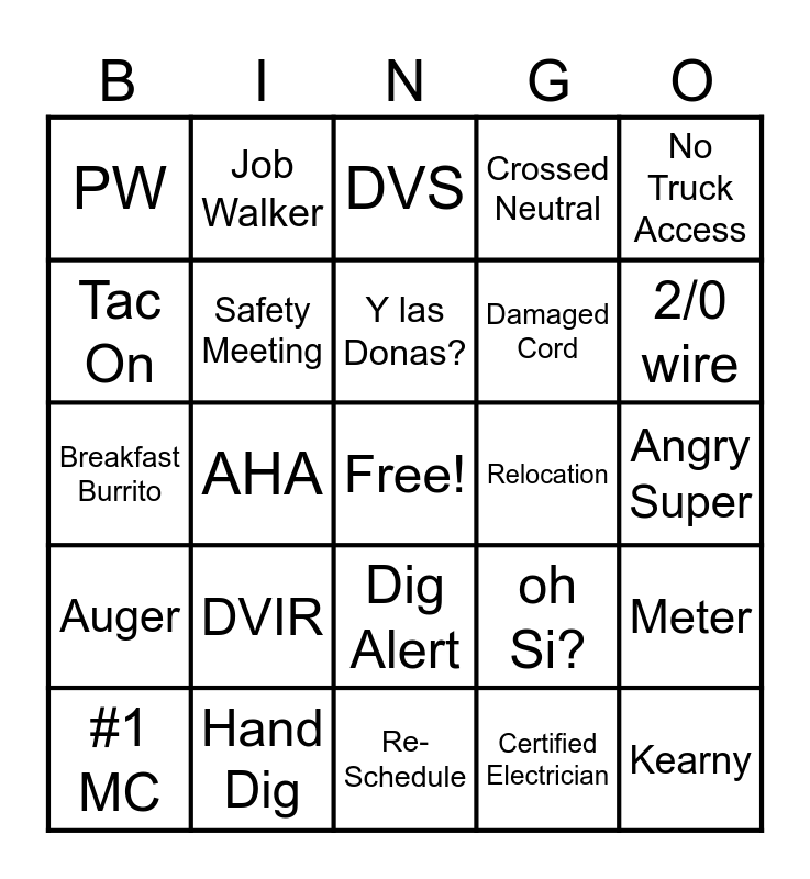This bingo card has a free space and 69 words: Broken Pole, Angry Super, No Call No Show, Service Call, Hand Dig, Black Diamond, Crossed Neutral, Bucket Truck, No Truck Access, Lead Installer, Meter, Failed Inspection, PW, DVS, no permit's, AHA, Dig Alert, Damaged Cord, wedge clamp, Auger, Relocation, oh Si?, 2/0 wire, Gas Line Hit, 250 MCM, #4 MC, U/G Cable, #2 Wire, Certified Electrician, 6/4 Cord, Job Walker, Mapper, Xmas Lunch, Water Line hit, 4/4 Cord, Step Down Transformer, Disconnect, Distro Cage, Tac On, Extended Riser, DVIR, Kearny, Ground Rod, Weekend Work, Main Breaker, #1 MC, hand hole, Flex Riser, Blown Fuse, Safety Meeting, Y las Donas?, puras Fallas, 6x6 Pole, Re-Schedule, Crane Truck, El Super Cambio el Jale, Forklift, el cisco no contesta, Hot Check, Breakfast Burrito, ese Pinchi Jon, Union Worker, texting and driving, 1/0 MC, Home Depot, Signed Ticket, Bad Breaker, Pole Popper and no lunch.