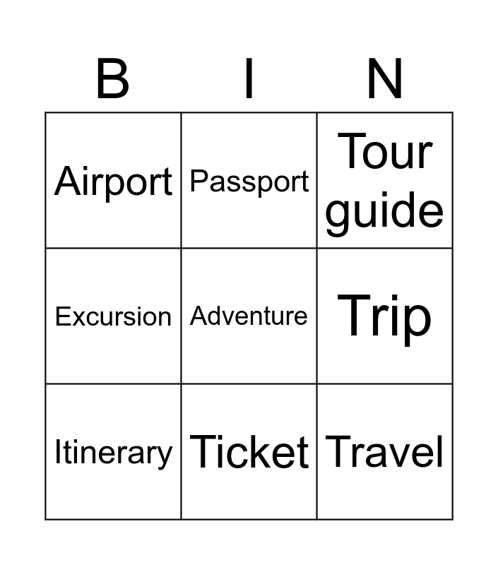 This bingo card has a free space and 8 words: Trip, Tour guide, Passport, Itinerary, Airport, Travel, Excursion and Ticket.