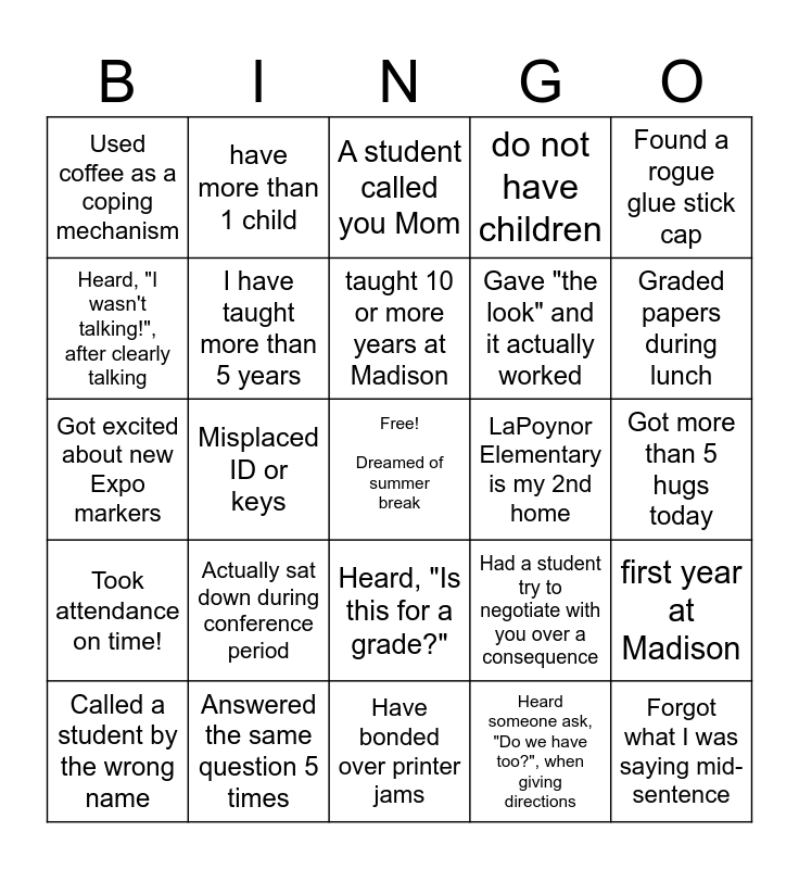 This bingo card has a free space and 29 words: Called a student by the wrong name, No one cried today!, Misplaced ID or keys, Your sound didn't work on a video, Used coffee as a coping mechanism, A student called you Mom, I have taught more than 5 years, Actually sat down during conference period, LaPoynor Elementary is my 2nd home, Answered the same question 5 times, Got more than 5 hugs today, Forgot what I was saying mid-sentence, Have bonded over printer jams, Heard someone ask, "Do we have too?", when giving directions, Graded papers during lunch, Smartboard froze during a lesson, Heard, "Is this for a grade?", Took attendance on time!, Found a rogue glue stick cap, Got excited about new Expo markers, Had a student try to negotiate with you over a consequence, Received a suspiciously sticky high five, Gave "the look" and it actually worked, Heard, "I wasn't talking!", after clearly talking, do not have children, have more than 1 child, first year at Madison, taught 10 or more years at Madison and can name the 2017-2018 Gala Awards Theme.