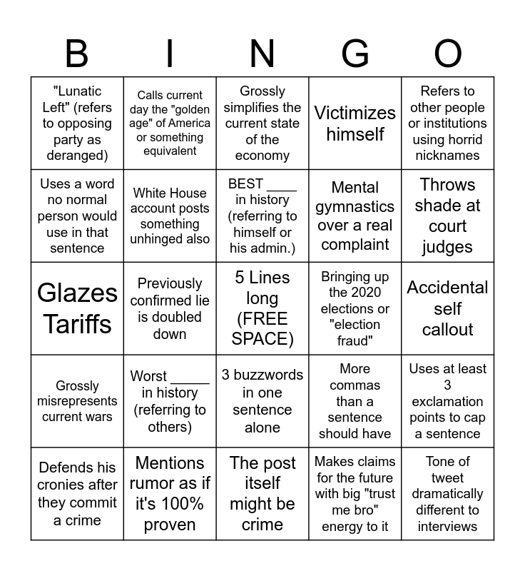 This bingo card has a free space and 37 words: CHINA, Referring or implying immigrants as criminals, MAGA (mentions his slogans), White House account posts something unhinged also, Uses at least 3 exclamation points to cap a sentence, Worst _____ in history (referring to others), BEST ____ in history (referring to himself or his admin.), Goes on a tangent mid sentence, Refers to other people or institutions using horrid nicknames, Backpedaling on previous promises, Previously confirmed lie is doubled down, Victimizes himself, Tone of tweet dramatically different to interviews, Accidental self callout, Uses a word no normal person would use in that sentence, Grossly misrepresents current wars, "There may be a liiiiiiittle hiccup along the way" (meekly admits his own faults), Grossly simplifies the current state of the economy, 3 buzzwords in one sentence alone, Bringing up the 2020 elections or "election fraud", "Lunatic Left" (refers to opposing party as deranged), Throws shade at court judges, Defends his cronies after they commit a crime, The post itself might be crime, Mentions statistics that are either way off or completely made up, Makes claims for the future with big "trust me bro" energy to it, Calls current day the "golden age" of America or something equivalent, Dodges mention of Russia on a topic that should involve them, Thinks business practices is the same as running policies, Human rights violations are masked as act of righteousness, Attacks media for literally just doing their job, Mentions rumor as if it's 100% proven, Glazes Tariffs, Rose tinted glasses history lesson, More commas than a sentence should have, Mental gymnastics over a real complaint and Random capitalizations for some reason.