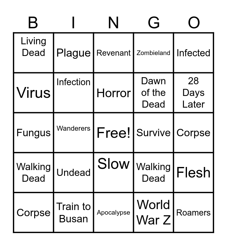 This bingo card has a free space and 25 words: Undead, Apocalypse, Horror, Corpse, Infected, Living Dead, Virus, Plague, Survive, Slow, Dawn of the Dead, Fungus, Walking Dead, Flesh, Infection, Bite, Corpse, Revenant, 28 Days Later, Wanderers, Roamers, Train to Busan, Walking Dead, Zombieland and World War Z.