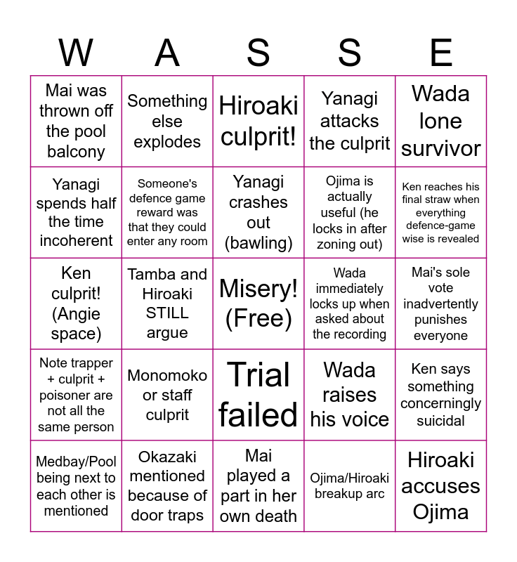 This bingo card has a free space and 24 words: Monomoko or staff culprit, Okazaki mentioned because of door traps, Yanagi crashes out (bawling), Medbay/Pool being next to each other is mentioned, Wada lone survivor, Mai was thrown off the pool balcony, Yanagi spends half the time incoherent, Something else explodes, Wada immediately locks up when asked about the recording, Trial failed, Ojima is actually useful (he locks in after zoning out), Ken culprit! (Angie space), Wada raises his voice, Ken says something concerningly suicidal, Someone's defence game reward was that they could enter any room, Ojima/Hiroaki breakup arc, Mai's sole vote inadvertently punishes everyone, Hiroaki culprit!, Ken reaches his final straw when everything defence-game wise is revealed, Tamba and Hiroaki STILL argue, Hiroaki accuses Ojima, Note trapper + culprit + poisoner are not all the same person, Yanagi attacks the culprit and Mai played a part in her own death.