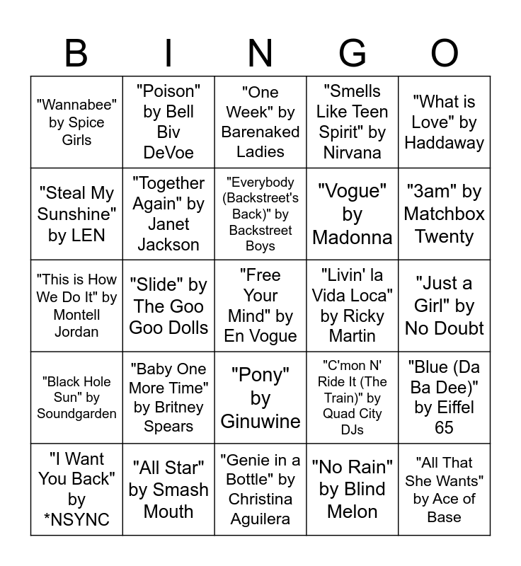 This bingo card has 25 words: "Baby One More Time" by Britney Spears, "Genie in a Bottle" by Christina Aguilera, "Everybody (Backstreet's Back)" by Backstreet Boys, "I Want You Back" by *NSYNC, "What is Love" by Haddaway, "Wannabee" by Spice Girls, "Steal My Sunshine" by LEN, "Poison" by Bell Biv DeVoe, "Livin' la Vida Loca" by Ricky Martin, "Pony" by Ginuwine, "Vogue" by Madonna, "This is How We Do It" by Montell Jordan, "C'mon N' Ride It (The Train)" by Quad City DJs, "Blue (Da Ba Dee)" by Eiffel 65, "Together Again" by Janet Jackson, "All That She Wants" by Ace of Base, "Just a Girl" by No Doubt, "One Week" by Barenaked Ladies, "3am" by Matchbox Twenty, "Slide" by The Goo Goo Dolls, "Free Your Mind" by En Vogue, "All Star" by Smash Mouth, "Black Hole Sun" by Soundgarden, "Smells Like Teen Spirit" by Nirvana and "No Rain" by Blind Melon.