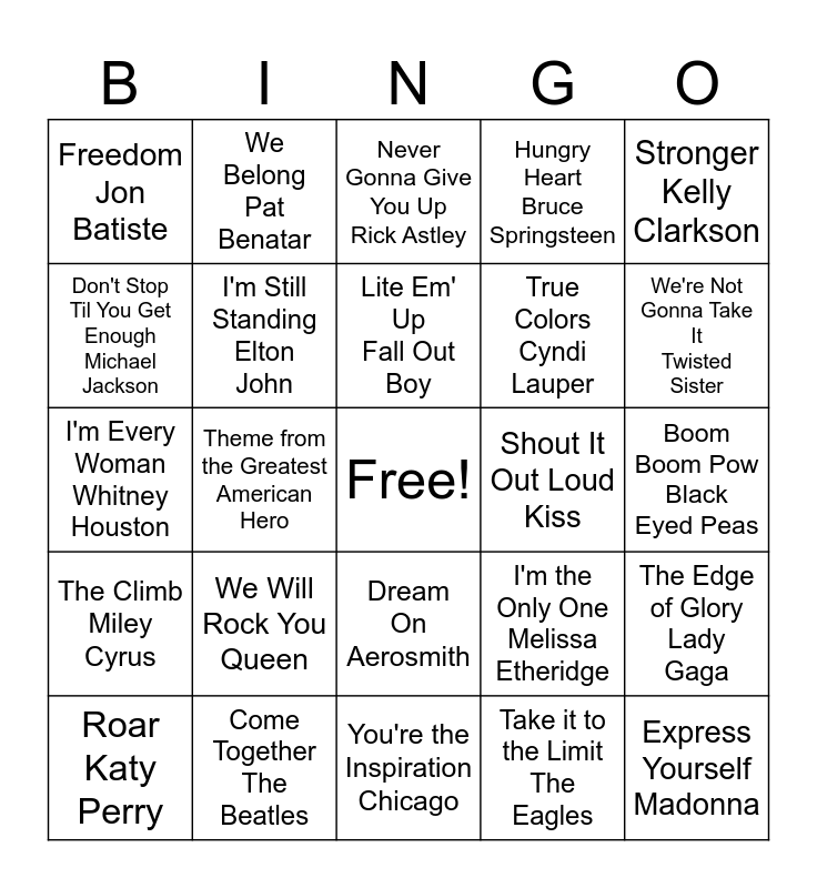This bingo card has a free space and 24 words: We Will Rock You Queen, Come Together The Beatles, Lite Em' Up Fall Out Boy, Roar Katy Perry, Stronger Kelly Clarkson, Freedom Jon Batiste, Don't Stop Til You Get Enough Michael Jackson, We Belong Pat Benatar, Shout It Out Loud Kiss, Dream On Aerosmith, True Colors Cyndi Lauper, I'm Every Woman Whitney Houston, I'm the Only One Melissa Etheridge, The Edge of Glory Lady Gaga, I'm Still Standing Elton John, Take it to the Limit The Eagles, Boom Boom Pow Black Eyed Peas, Never Gonna Give You Up Rick Astley, We're Not Gonna Take It Twisted Sister, Theme from the Greatest American Hero, Express Yourself Madonna, The Climb Miley Cyrus, Hungry Heart Bruce Springsteen and You're the Inspiration Chicago.