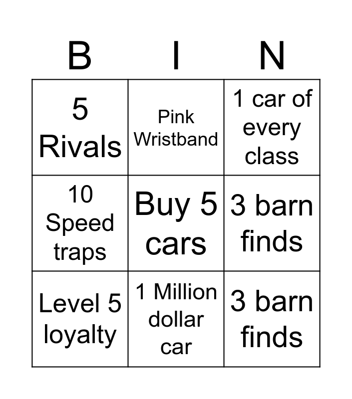 This bingo card has a free space and 10 words: 1 Million dollar car, 1 car of every class, 5 Rivals, 3 barn finds, 10 Speed traps, Level 5 loyalty, Pink Wristband, Win 10 showcase, 3 barn finds and 20 discount boards.