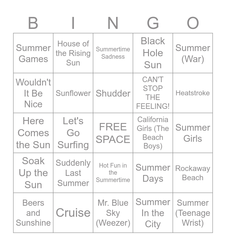 This bingo card has a free space and 75 words: Cruel Summer (Taylor Swift), Summer (Calvin Harris), Summertime Sadness, SUMMER (The Carters), Summer of '69, Island in the Sun, Pumped Up Kicks, Heatstroke, Watermelon Sugar, Heat Waves, Sunroof, sunburn, Shudder, Wouldn't It Be Nice, SUMMER VIBES, Let's Go Surfing, Summer (Marshmello), Summer (Teenage Wrist), Summer (Imagine Dragons), Summer (War), Summer (Sum 41), Here Comes the Sun, Sunflower, House of the Rising Sun, Black Hole Sun, Staring at the Sun, In the Summertime, Jet Airliner, Summertime (The Sundays), Summertime (Kenny Chesney), Summertime (DJ Jazzy Jeff & The Fresh Prince), Summertime (Ella Fitzgerald), Summer Love, Summer Days, Heatstroke, CAN'T STOP THE FEELING!, Dynamite, Summer Feelings, Summer Girls, Summer In the City, All Summer Long, Summer Nights, Cruel Summer (Bananarama), Summer Wind, Cool for the Summer, My Own Summer (Shove It), Beers and Sunshine, Summer Games, Feel Good Hit of the Summer, The Boys of Summer, Under the Boardwalk, Hot Fun in the Summertime, Espresso, That Summer Feeling, Hot Girl Summer, Dancing in the Moonlight, Dancing in the Flames, Dancing in the Street, Saturday in the Park, Rock Lobster, Suddenly Last Summer, School's Out, Surf City, Hot in Herre, California Gurls, California Girls (The Beach Boys), California Girls (David Lee Roth), Vacation, Dancing Days, Rockaway Beach, Soak Up the Sun, Cruise, Mr. Blue Sky (Electric Light Orchestra), Mr. Blue Sky (Weezer) and American Girl.