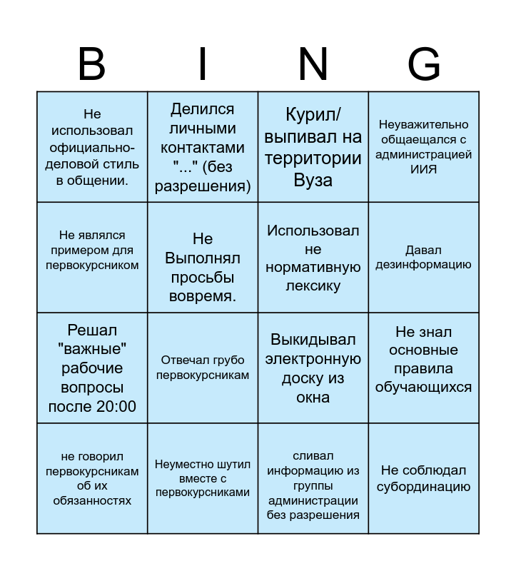 This bingo card has 16 words: не говорил первокурсникам об их обязанностях, Неуместно шутил вместе с первокурсниками, Курил/ выпивал на территории Вуза, Неуважительно общаещался с администрацией ИИЯ, Не являлся примером для первокурсником, Делился личными контактами "..." (без разрешения), Выкидывал электронную доску из окна, Не знал основные правила обучающихся, Не использовал официально-деловой стиль в общении., Не Выполнял просьбы вовремя., сливал информацию из группы администрации без разрешения, Давал дезинформацию, Решал "важные" рабочие вопросы после 20:00, Отвечал грубо первокурсникам, Использовал не нормативную лексику and Не соблюдал субординацию.