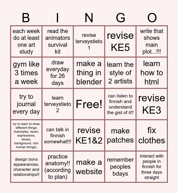 This bingo card has a free space and 24 words: can talk in finnish somewhat!!!, practice anatomy!! (according to plan), make a thing in blender, design bons appearances, character and relationships!!, write that shows main plot...!!!, each week do at least one art study, gym like 3 times a week, read the animators survival kit, can listen to finnish and understand the gist of it!!, revise KE1&2, learn the style of 2 artists, try to journal every day, make patches, fix clothes, draw everyday for 26 days, remember peoples bdays, revise KE3, revise terveystieto 1, learn how to html, learn terveystieto 2, interact with people in finnish for three days straight, try to learn to draw different things (hairstyles, faces, expressions, shoes, background, non human things), revise KE5 and make a website.